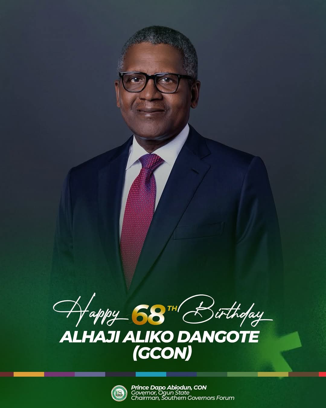 ” I want to heartily congratulate my friend and brother, Alhaji Aliko Dangote on the occasion of his birthday, on behalf of the government and the people of Ogun State, I wish him more fulfilled years in sound health.