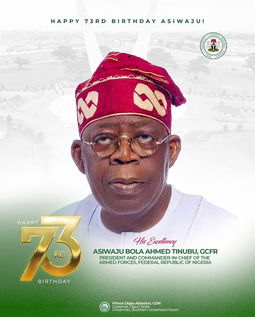 On behalf of the government and the good people of Ogun State, we celebrate a true leader, statesman, visionary, and our performing President, Asiwaju Bola Ahmed Tinubu, GCFR, as he marks his 73rd birthday.