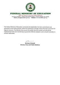 According to a press statement signed by Boriowo Folasade, Director, Press and Public Relations of the Federal Ministry of Education. The announcement was made on behalf of the Honourable Minister of Education, Dr. Maruf Tunji Alausa CON, by the Minister of State for Education, Professor Suwaiba Said Ahmad.