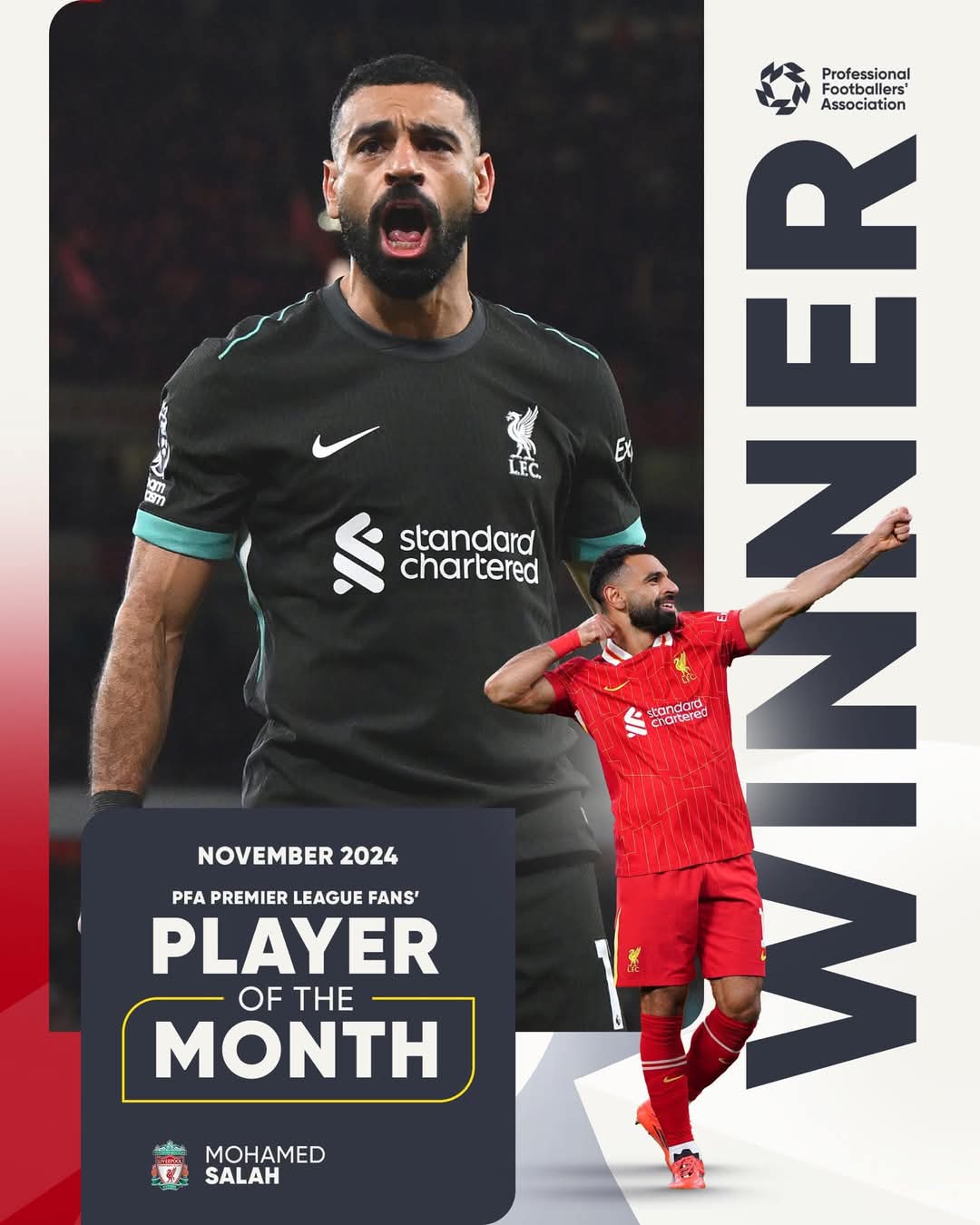 Mohamed Salah has been recognized as the Premier League Player of the Month for November, securing the award through a fan vote.