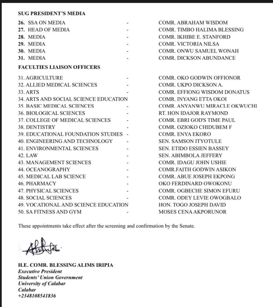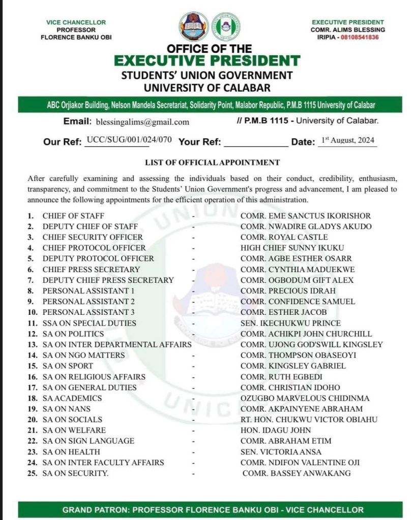 Blessing Alims, the first female President of the Student Union Government (SUG) at the University of Calabar, has explained her decision to appoint 50 individuals to advisory roles in her administration.